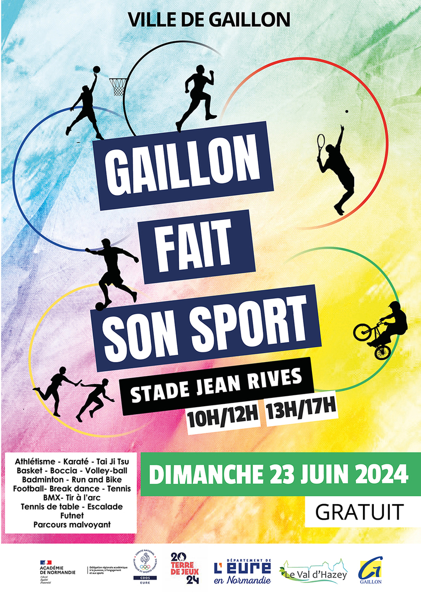 ans le cadre de cette journée, le service des sports mutualisé entre la ville de Gaillon et la ville du Val d'Hazey en  partenariat avec le Comité Départemental Olympique et Sportif de l'Eure (CDOS.27) souhaite mettre en place à une journée autour de la découverte des activités physiques et sportives. Cette journée est programmée le dimanche 23 juin 2024 sur le stade Jean Rives de Gaillon,